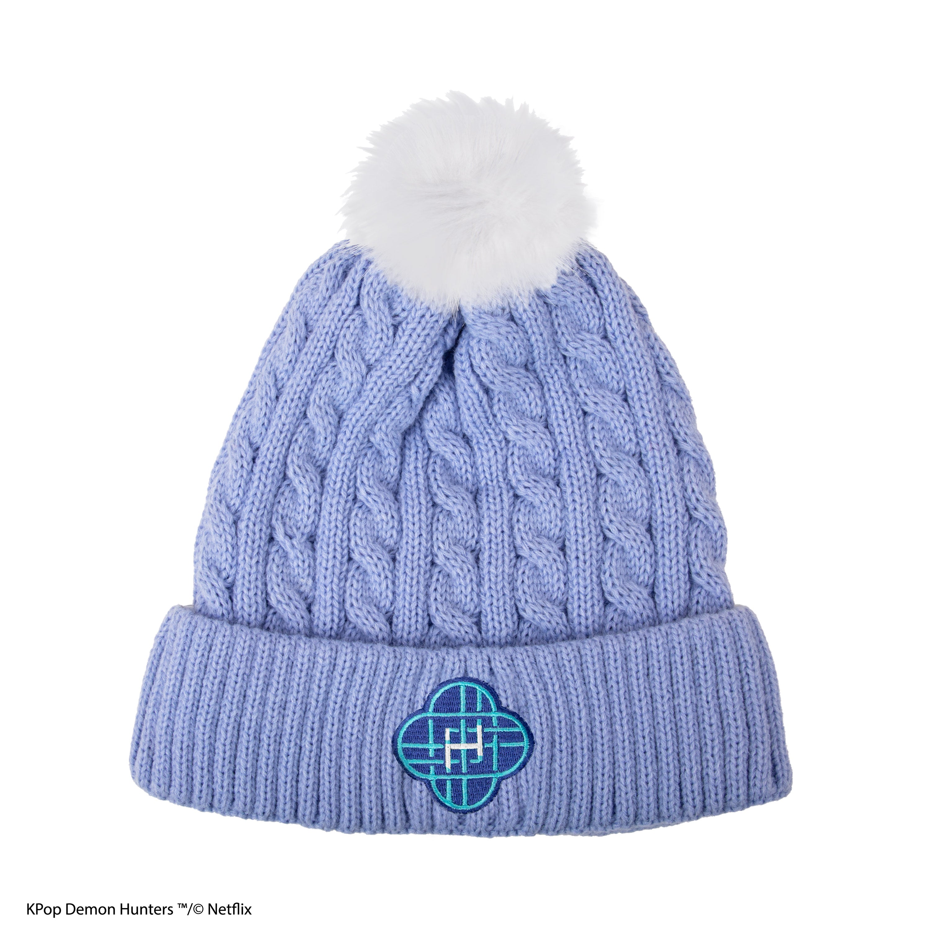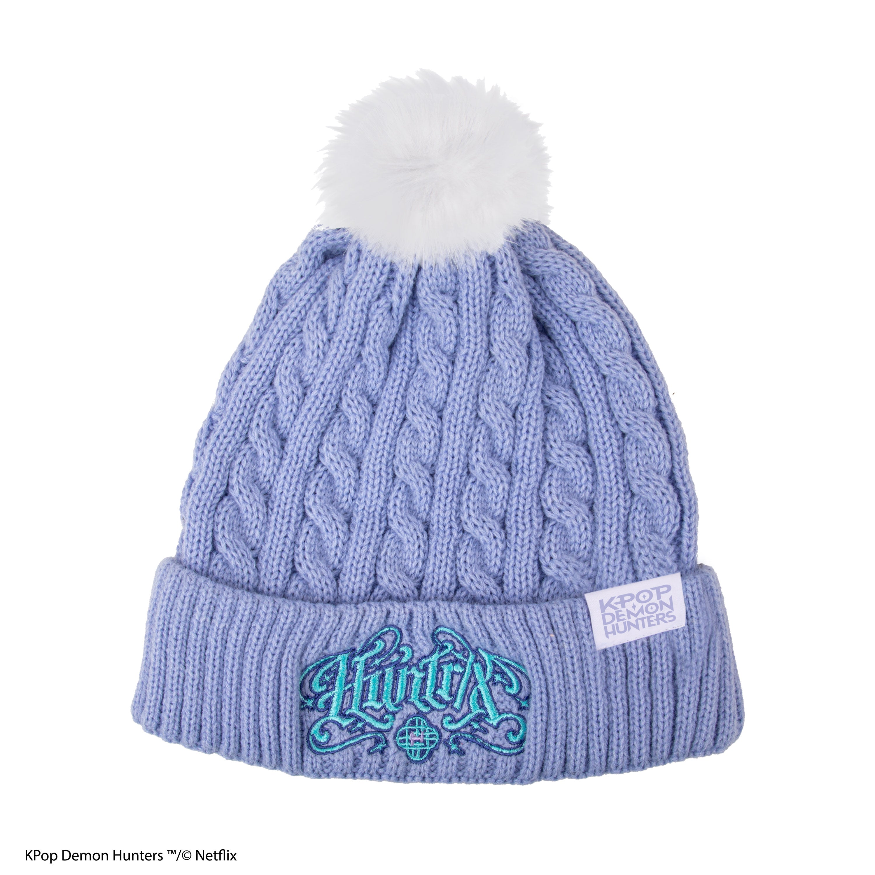 The soft cable knit gives the beanie a cozy texture, and the fluffy pom-pom adds a playful touch. A folded cuff features the bold HUNTR/X embroidery and a subtle KPop Demon Hunters label, resulting in a stylish piece that looks just as good on city streets as it does cheering for your favorite hunters.