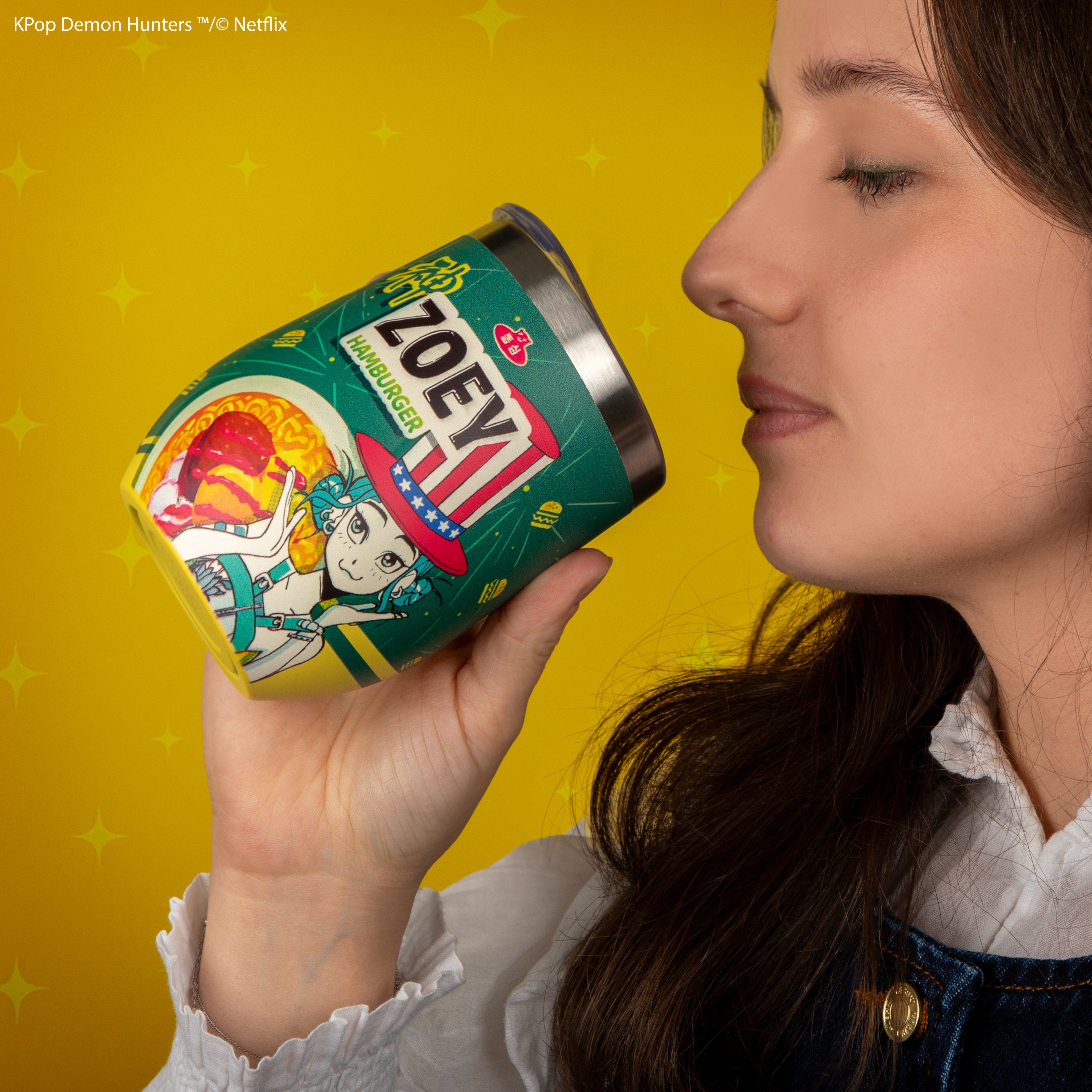 Add a playful twist to your daily drinks with the Zoey Hamburger Thermal Travel Mug, inspired by Zoey’s fun-loving personality from KPop Demon Hunters. Featuring colorful character artwork and bold graphic details, this stainless steel thermal mug blends pop anime flair with eye-catching design, making it a standout piece for fans.