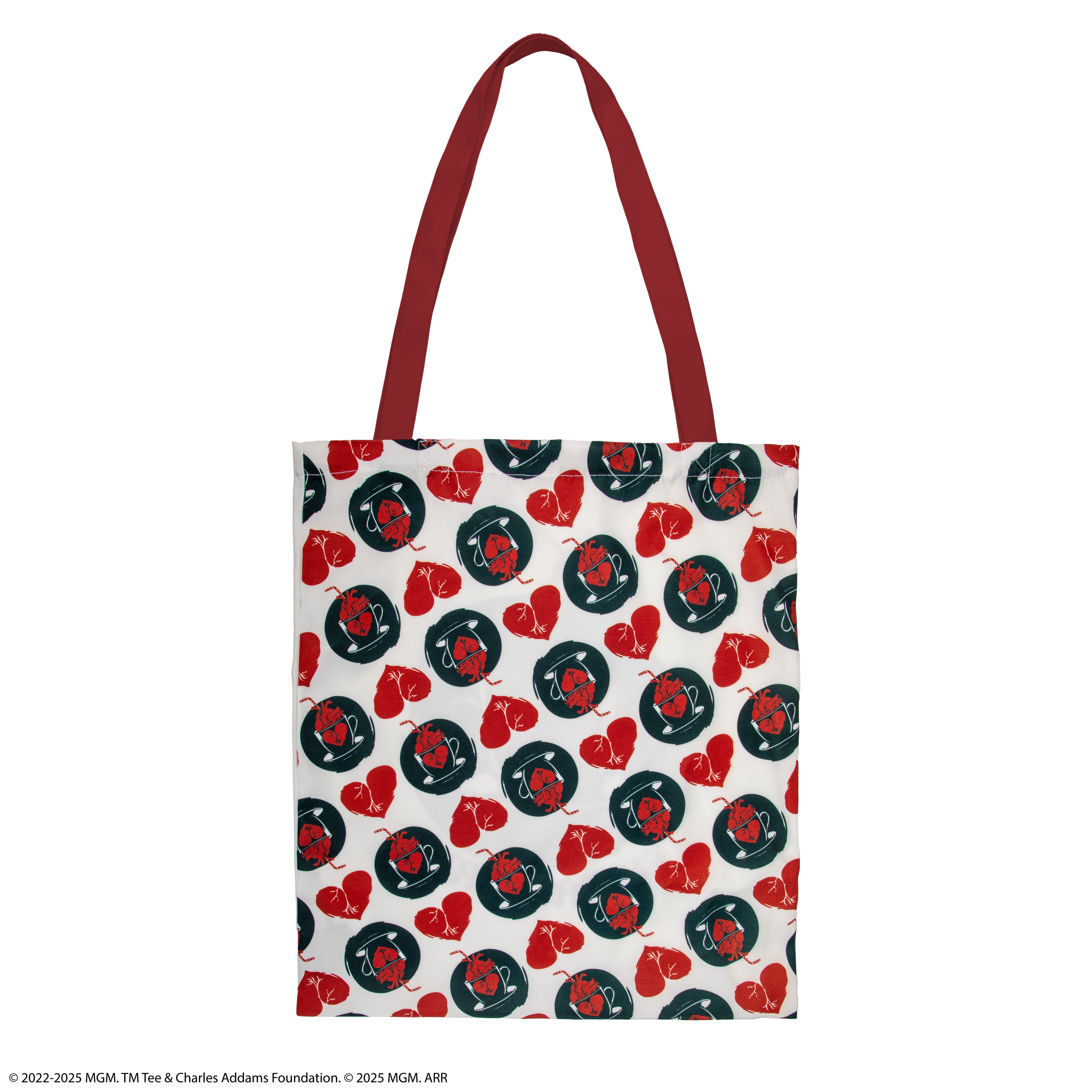 One side of this tote features the morbidly charming Tell-Tale Cafe logo, while the reverse side displays an all-over pattern of the heart-in-a-cup motif. This dual design perfectly captures the series’ blend of gothic charm and literary dark humor.
