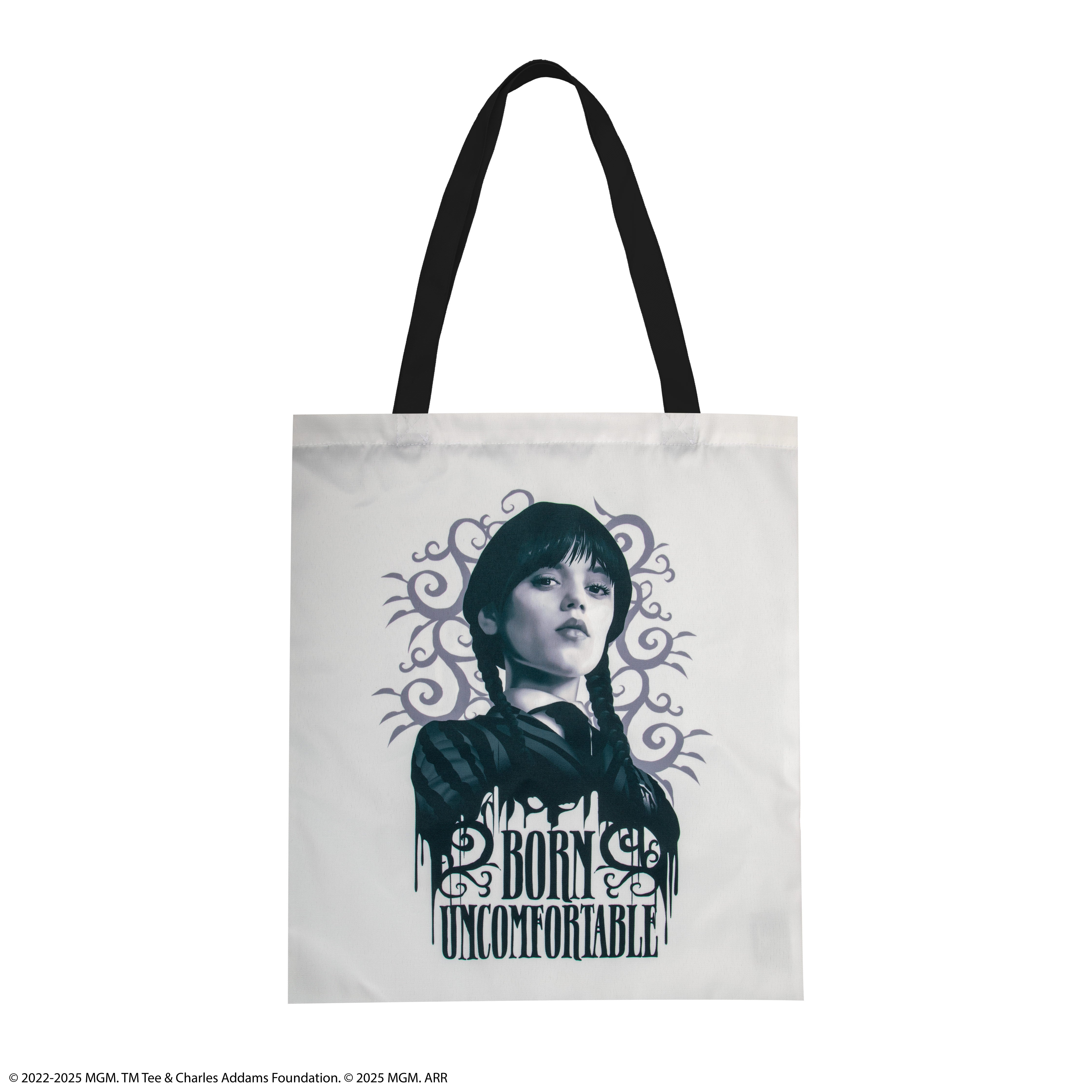 Wednesday Addams stands with her signature deadpan expression framed by dark swirling motifs and the quote “Born Uncomfortable” on one side. The other side showcases her loyal companion, Thing, under the witty phrase “Single-Handedly Handy,” perfectly capturing the series’ mix of dark humor and eerie charm.