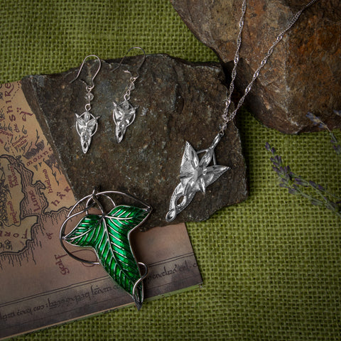 Tauchen Sie mit unserer bezaubernden Evenstar-Halskette in die ätherische Schönheit Mittelerdes ein. Dieses großartige Stück diente als Darstellung von Arwen Undómiels unerschütterlicher Liebe zu Aragorn, dem sterblichen Waldläufer.