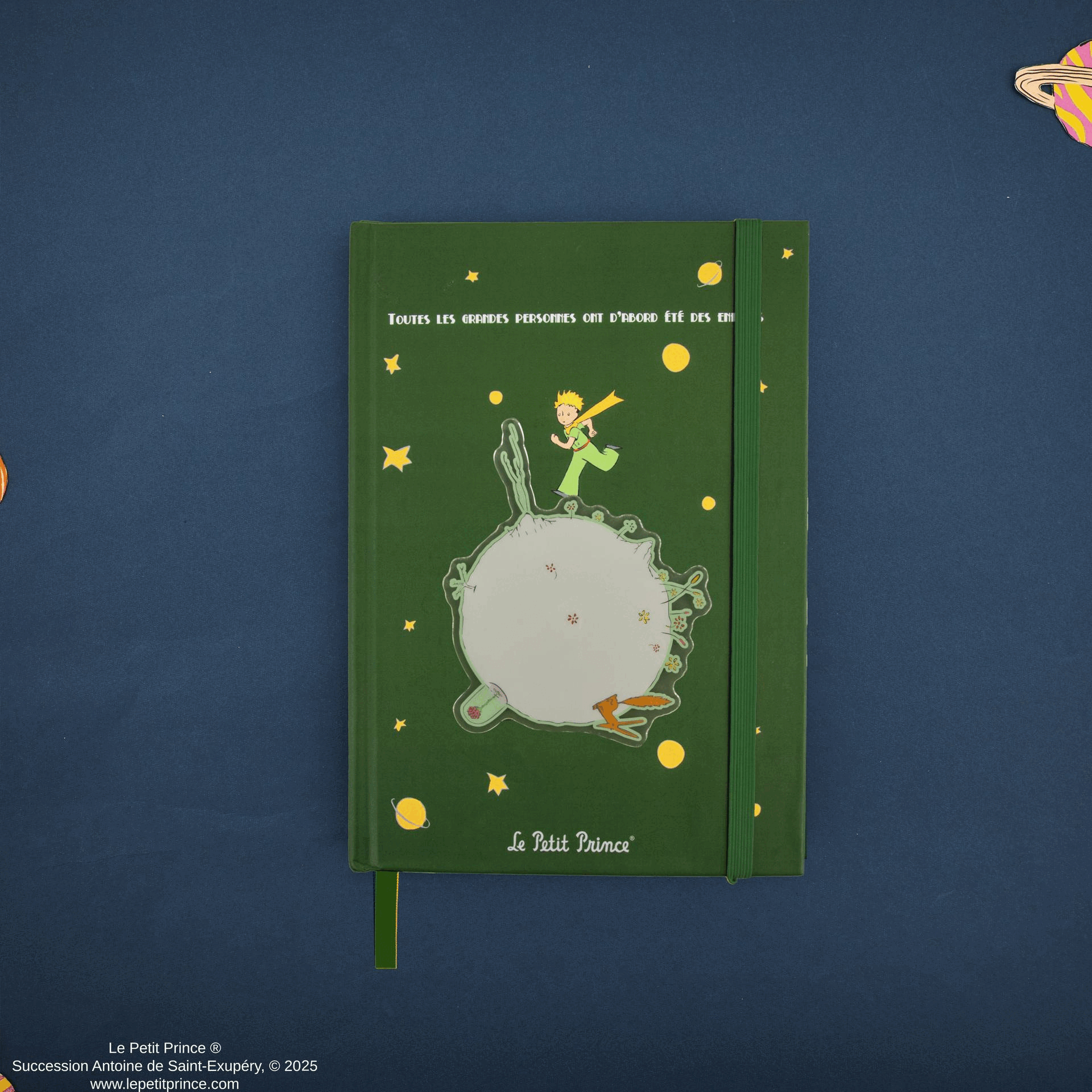 Das Notizbuch besticht durch ein einzigartiges Design mit einem lebhaften grünen Einband, der den ruhigen Kleinen Prinzen zeigt, wie er auf seinem rotierenden Asteroiden läuft. Ein passendes Gummiband hält Ihre Notizen sicher zusammen, damit kein Gedanke oder Geheimnis in der großen Weite verloren geht und das Zitat „Toutes les grandes personnes ont d'abord été des enfants“, das übersetzt „Alle großen Leute waren zuerst Kinder“, erinnert Sie daran, dass unser freier Geist das größte Lebensgut ist.