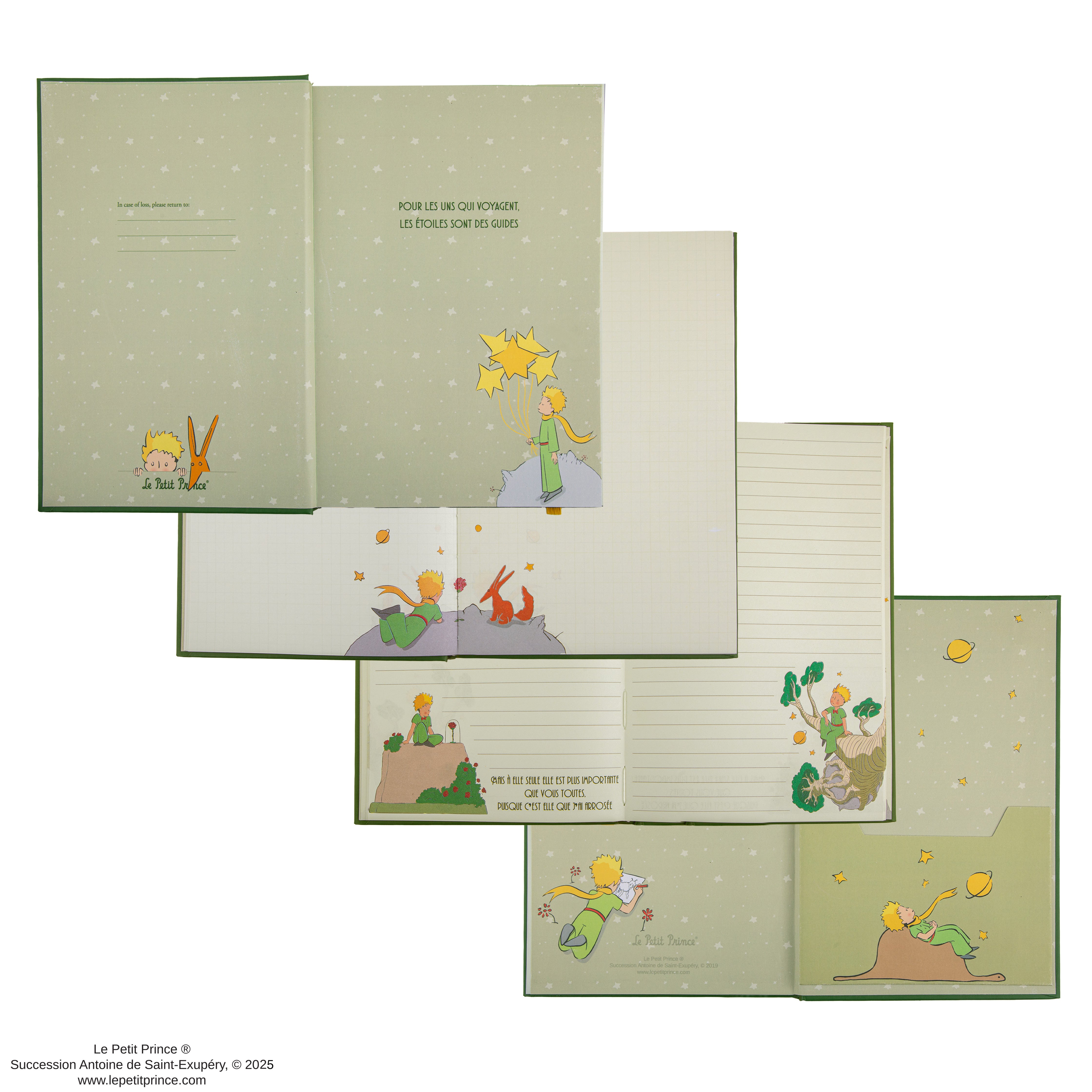 Mit so vielen Gedanken und Skizzen, die während seines Abenteuers festgehalten werden wollen, ist dieses Notizbuch vom Kleinen Prinzen inspiriert, der durch das weite Universum wandert.