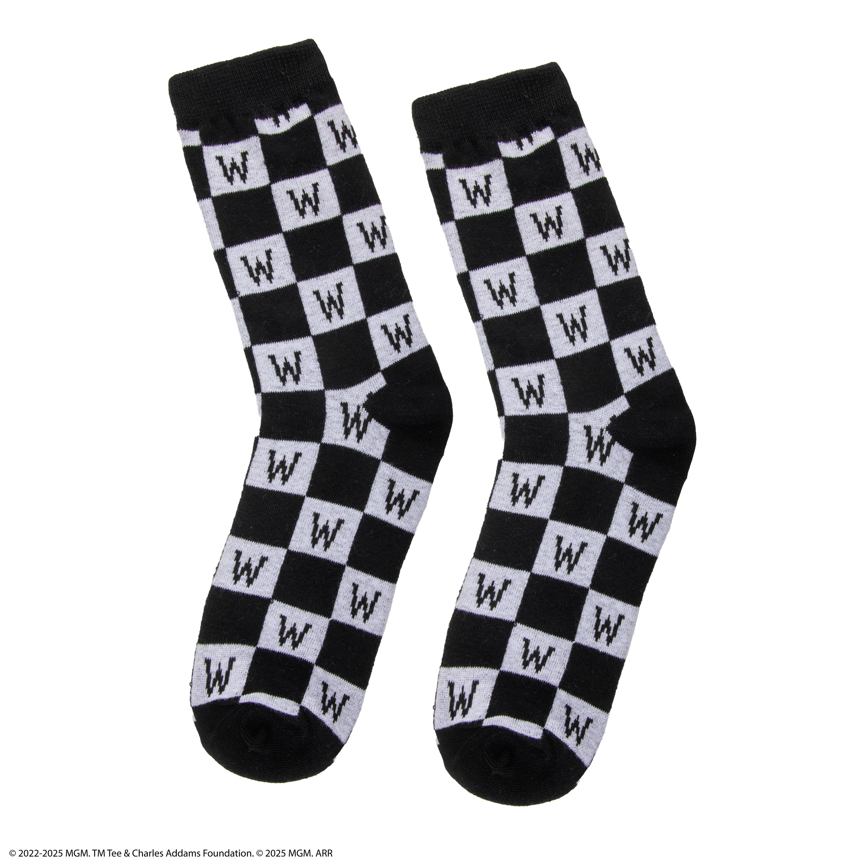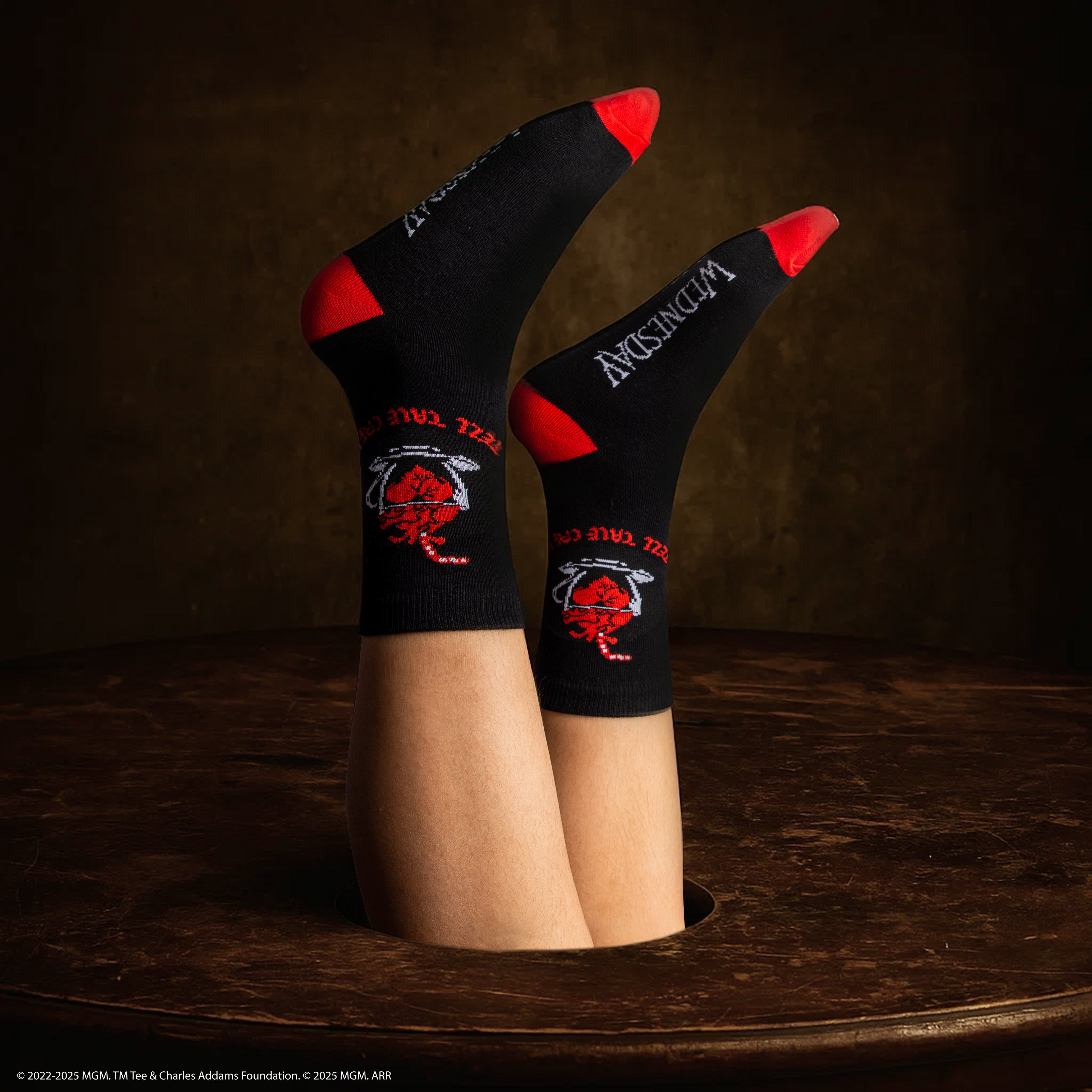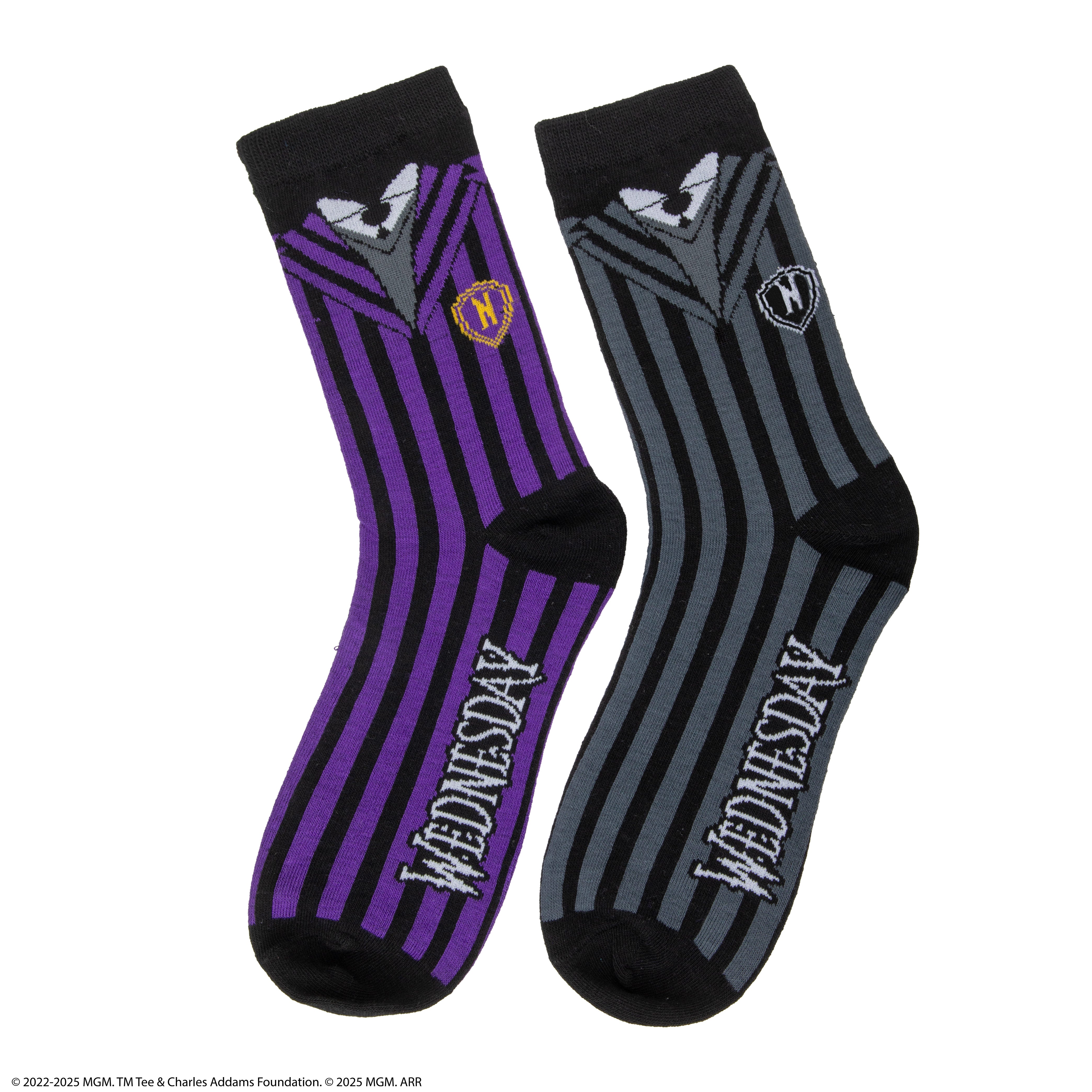 Esta colección presenta tres diseños distintivos y de alta calidad. El primer par es un calcetín negro y rojo con un creativo gráfico de corazón sangrante y taza de té de la Temporada 2. El segundo par presenta un dinámico patrón de tablero de ajedrez en blanco y negro, acentuado con la letra "W". El tercer diseño refleja el icónico uniforme de la Academia Nevermore en llamativas rayas moradas y negras.