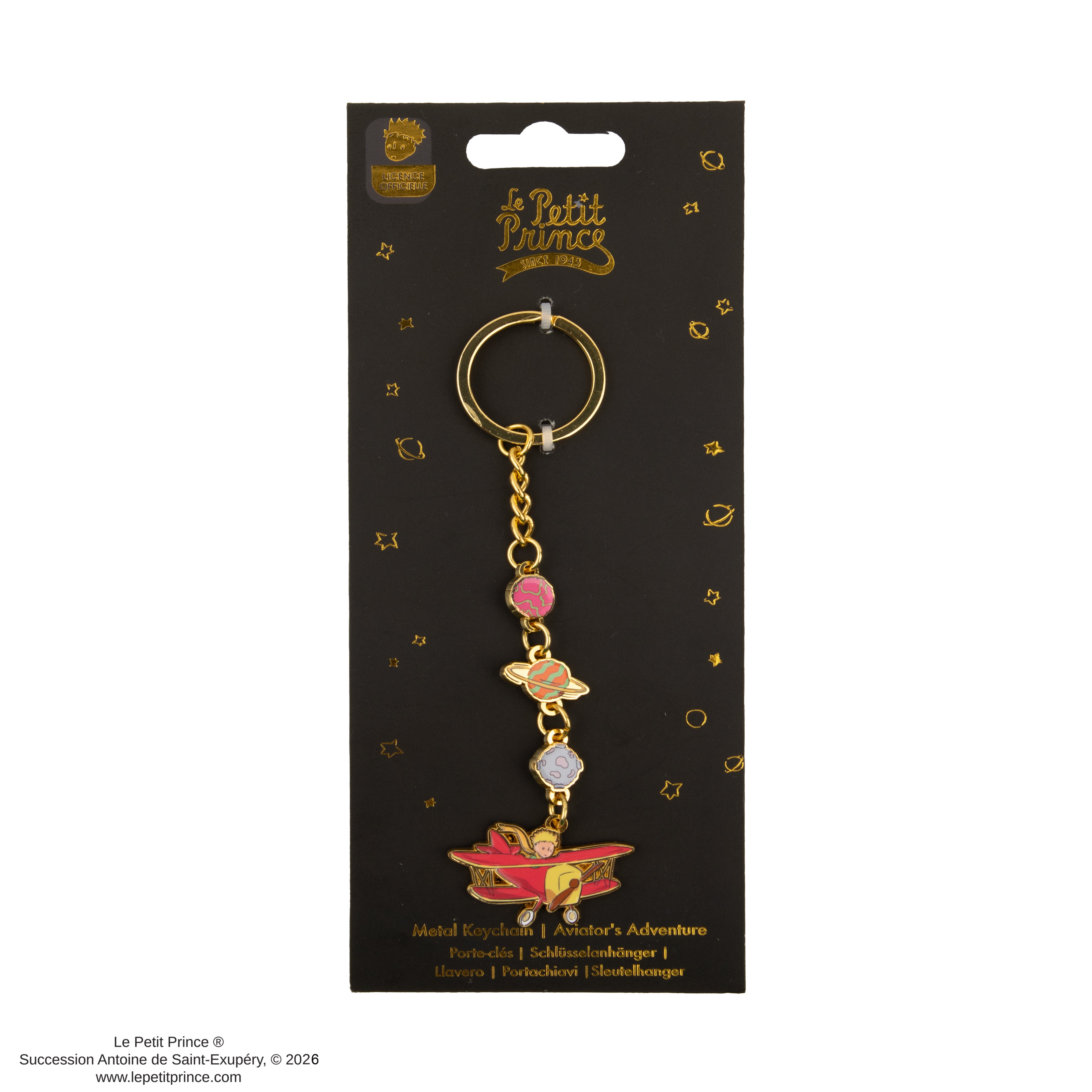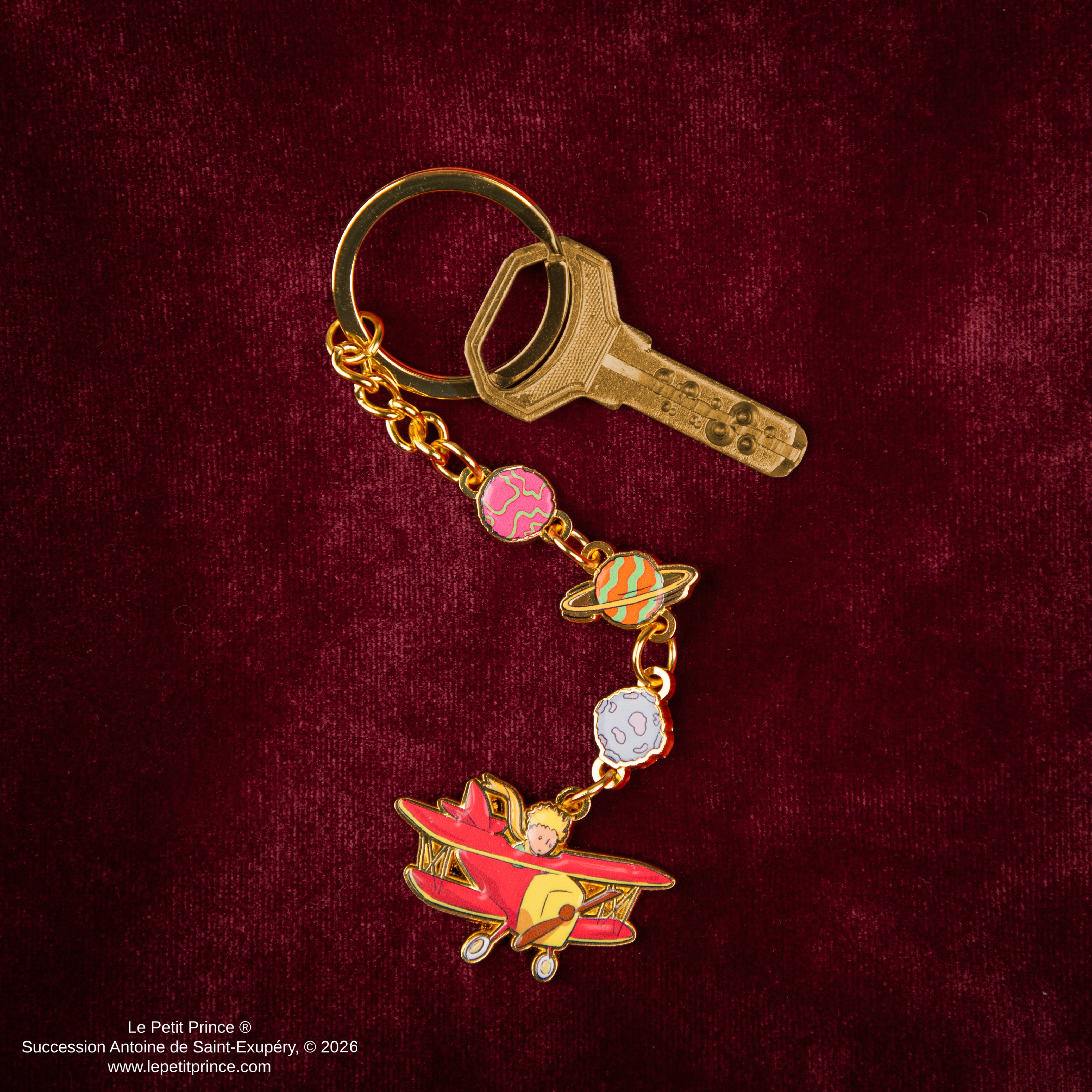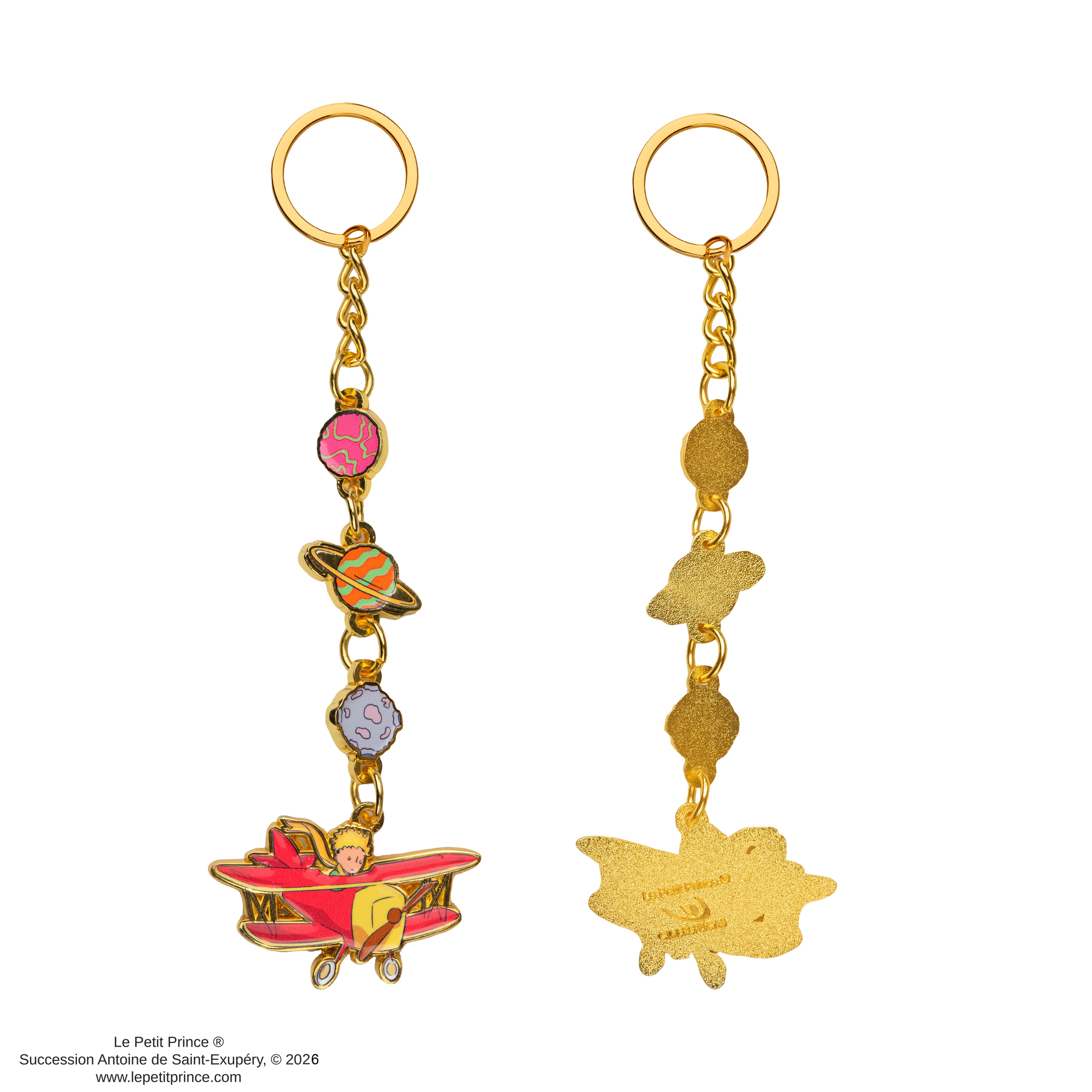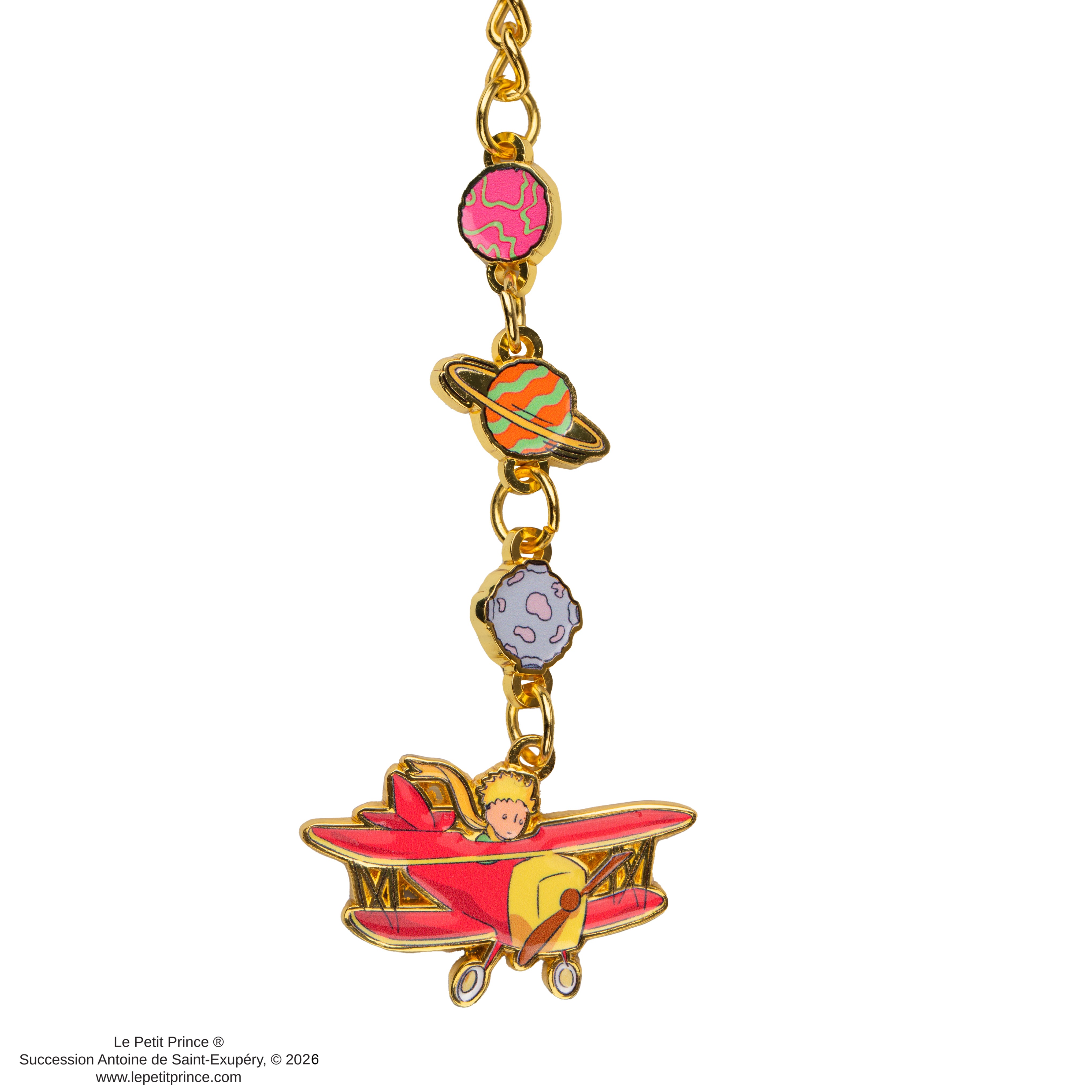 Introducing the Le Petit Prince Adventure Keychain, a delightful accessory inspired by Antoine de Saint-Exupéry's timeless story about exploration and imagination. This keychain includes a beautifully crafted pendant of the Little Prince flying in his whimsical red plane, surrounded by colorful planets, adding a sense of adventure and wonder to the piece while reflecting the joy of discovery.