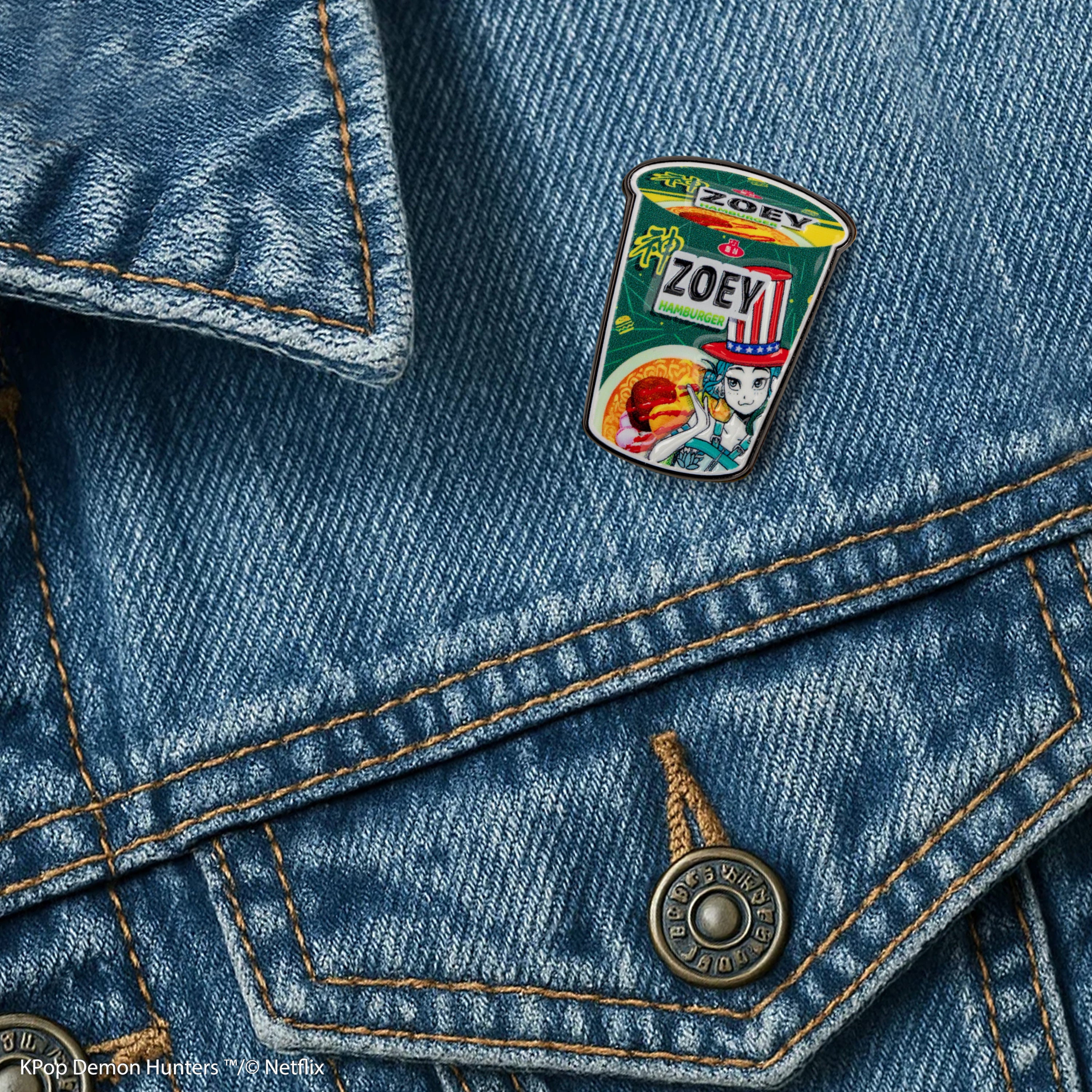 Turn up the flavor and the fandom with this Zoey Hamburger Noodles pin from KPop Demon Hunters! Bursting with bold colors, playful details, and serious attitude, this pin captures Zoey’s fearless energy with a fun, food-inspired twist. From the iconic noodle cup shape to the quirky hamburger visuals and Zoey’s confident pose, every detail is designed to stand out.