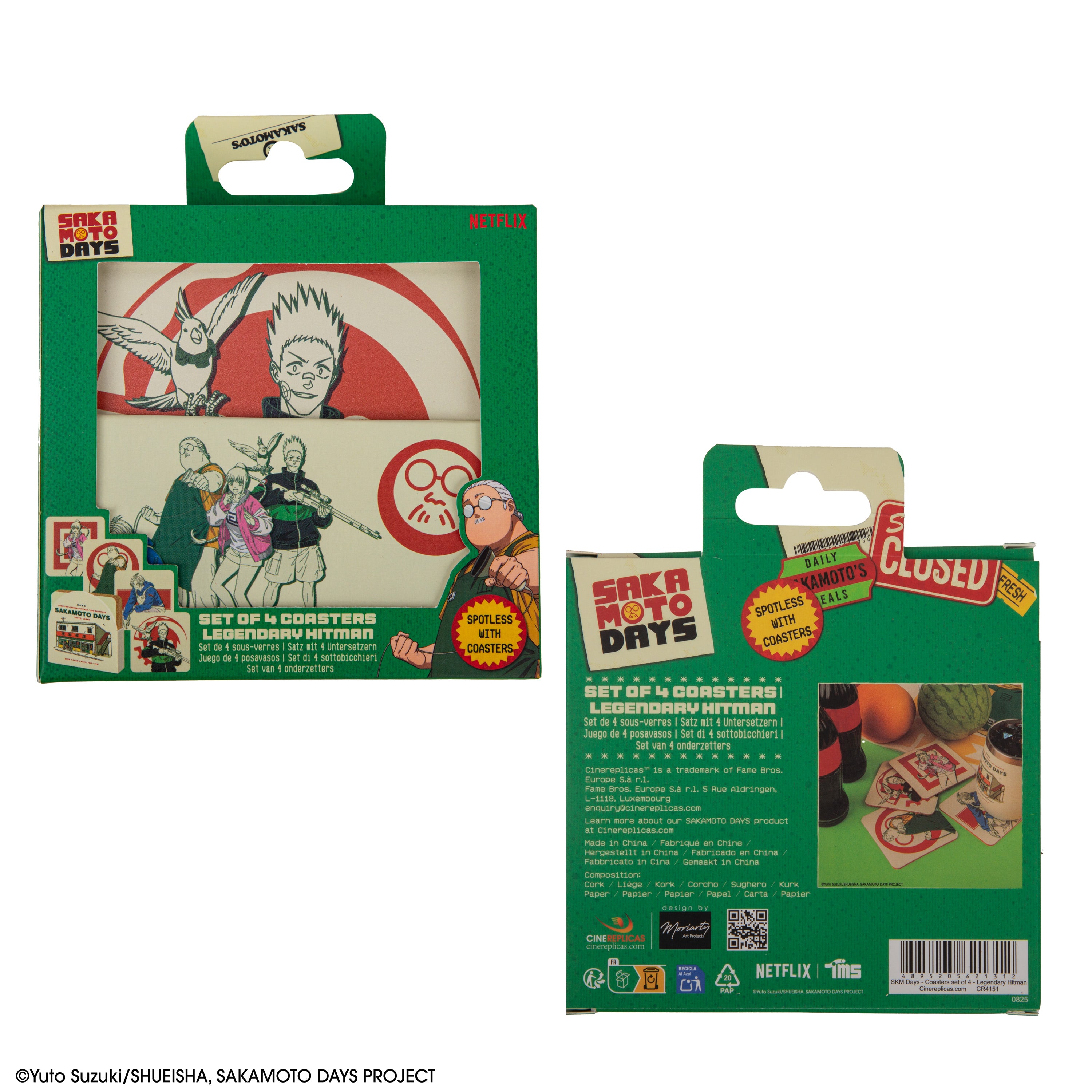 Beyond their stylish design, these coasters are made to protect your surfaces from heat, moisture, and everyday spills. The cork base prevents slipping and scratching on tables, while the smooth printed surface ensures easy cleaning after use. Perfect for daily use or as a collectible display, this coaster set is a functional piece of Sakamoto Days memorabilia for fans who want to bring a little action from the store into their own space.